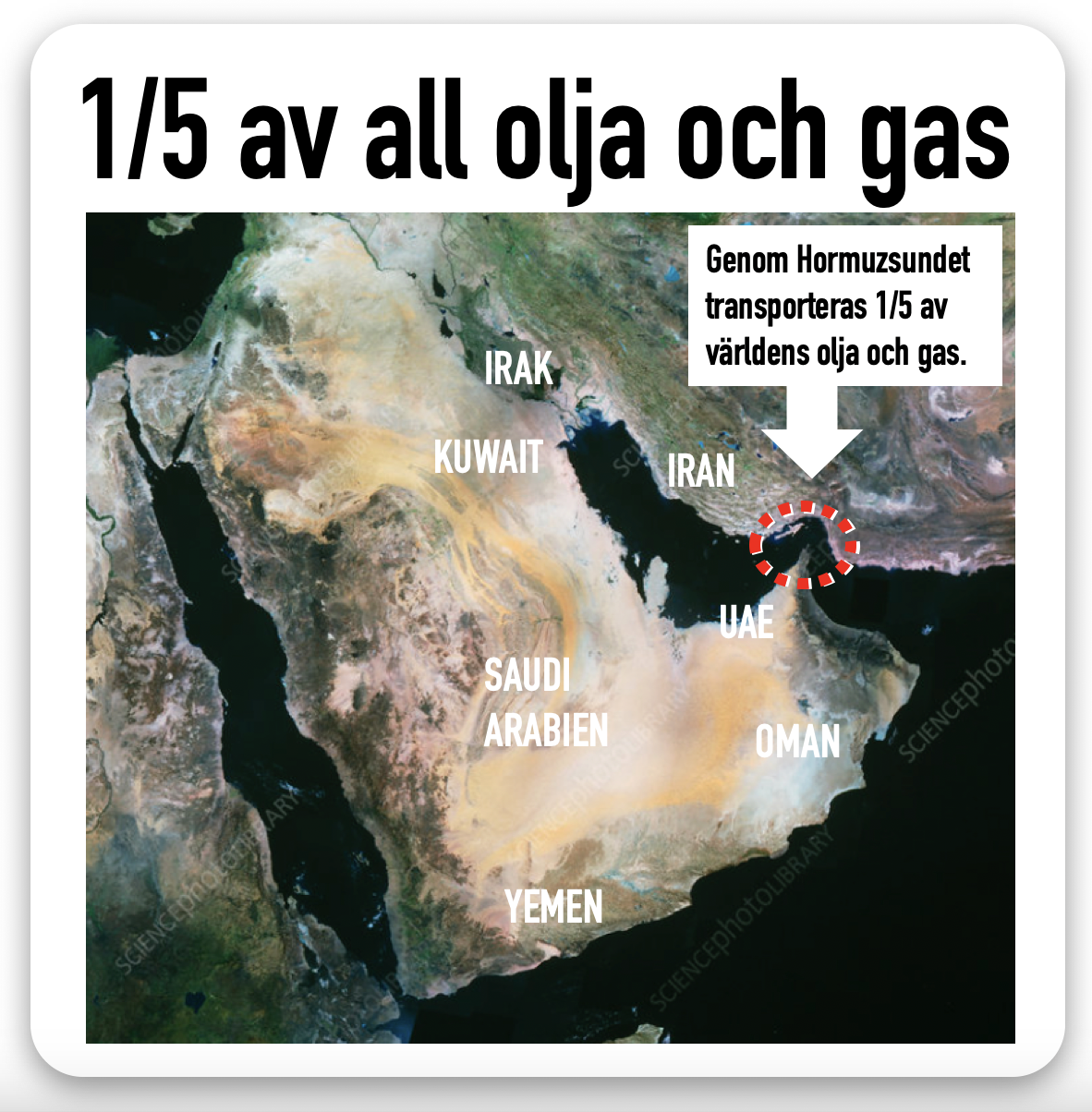 För det sund – Hormuzsundet – som är utanför den iranska kusten kan mycket väl bli stängt för trafik. Det kan stoppa en femtedel av världens olja och gas. Något som inte hotar tillgången, men syns direkt i en rad energipriser.