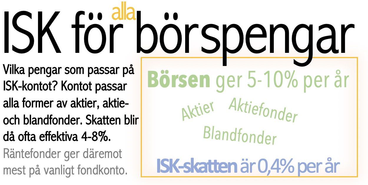 På bara tio år har svenskarnas ISK-fonder vuxit från noll till 577 mdr. Innehaven i aktier lär vara lika stora. Det var så sent som i början på året som ISK sprang förbi föregångaren vanliga fonder som tagit sig 40 år att nå samma nivå. Så sent som i fjol sattes nytt ISK-rekod när antalet ISK-sparare ökade med hela 400 000 personer, till hela 3,1 miljoner svenskar enligt skatteverket.