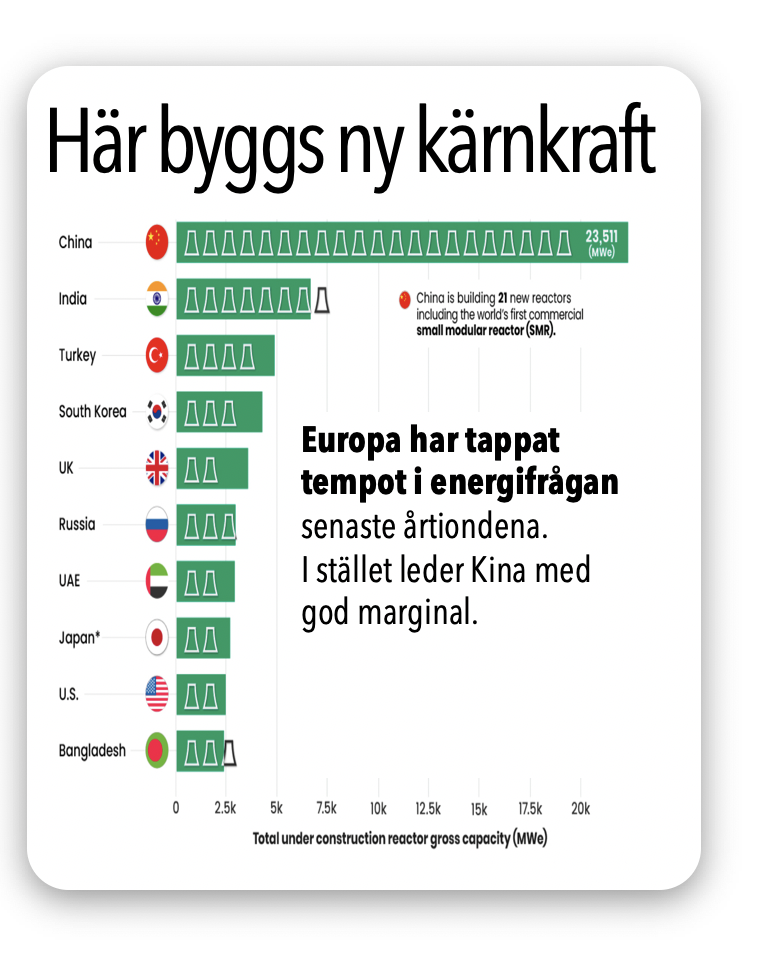 Det blir i så fall snabbare än kinesiska kärnkraften som nu rullas ut i högt tempo. Nej, det beror på hur vi räknar. Från första politikerlöftet 2023 går det ändå att räkna färdig reaktor till 13 år. Det är nära västs snitt senaste årtiondet.