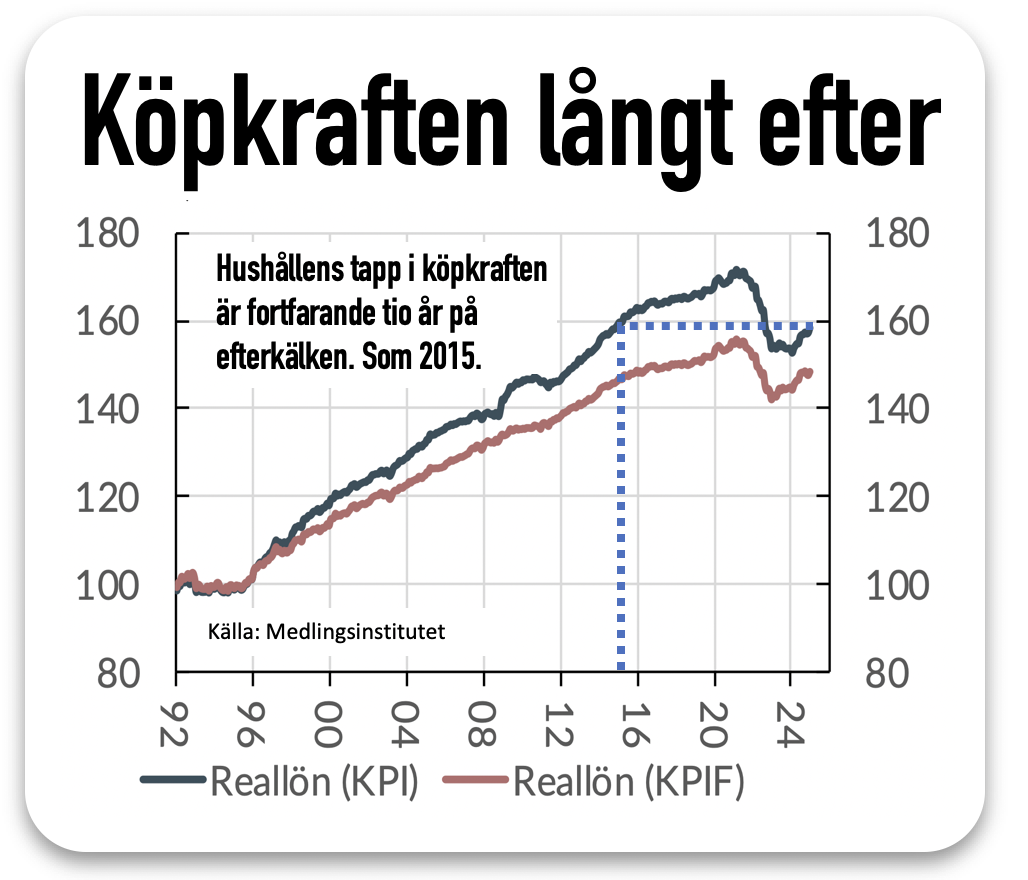 I bästa fall kan köpkraften vara åter redan nästa år, men märk väl att vi då har samma köpkraft som 2021. Vi har ändå tappat i storleksordningen 12 procent av vår köpkraft under inflationskrisen, något hushållen behöver många fler år att hämta ikapp.