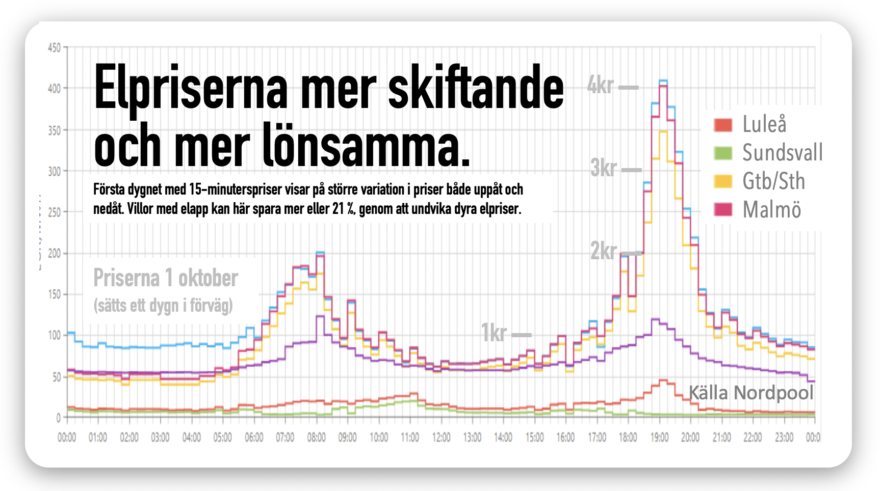 Första dagen med 15-minuters elpriser har dubblat vissa priser. Omvänt kan dalarna stundtals 1 kronor under. För hushåll som tar hjälp av appar borde skillnaderna bli en tydlig fördel.