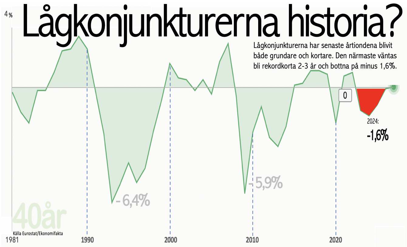 De senaste årtiondena har lågkonjunkturerna blivit allt kortare och mindre djupa. Nedgången nästa år väntas bli den ljummaste nedgången i konjunktur i modern tid. Är det ett tecken att lågkonjunkturen är död? Ja, kanske den stora skrämmande lågkonjunkturen är förbi.