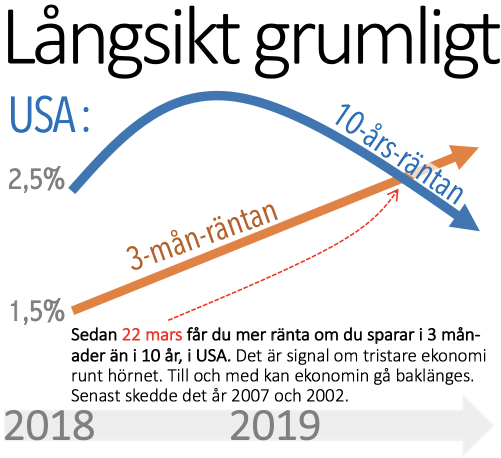 Mindre ränta för att låna i 10 år än bara 3 månader. Det låter helt galet. Så är det just nu i USA. Det är en klassisk signal om större inbromsning i ekonomin. En recession. Kortsiktiga politiker och centralbanker är en orsak. Långsiktighet är svaret.