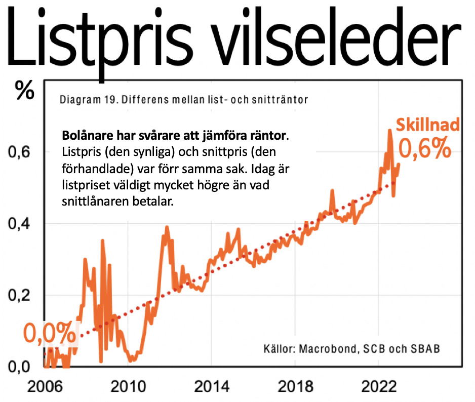 Allt för att få konsumenterna att se vad de betalar i onödan. Idag betalar snitt-lånaren också 0,6-0,7% lägre än listpriset. Eller 18 000 kr per år.