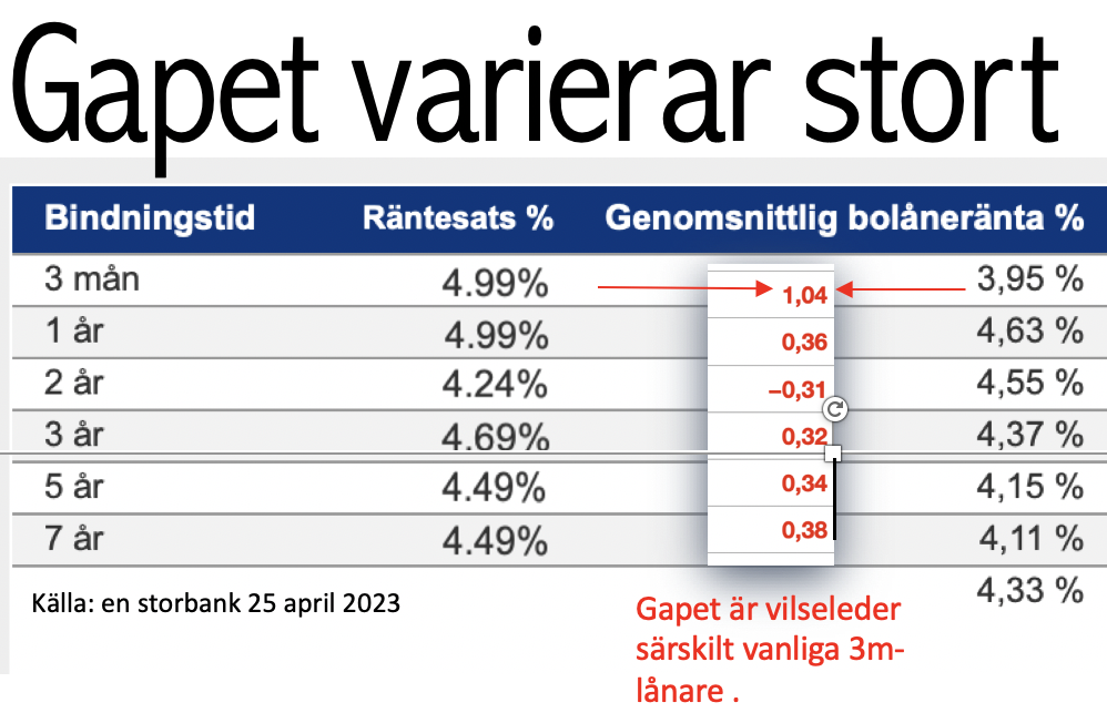 Räntegapet varierar dessutom kraftigt beroende på bindningstid. I bankexemplet här så är skillnaden över 1%-enhet på den kortaste räntan. Är bolånaren mest blyg där? Det är oroväckande, eftersom den är vanligast.