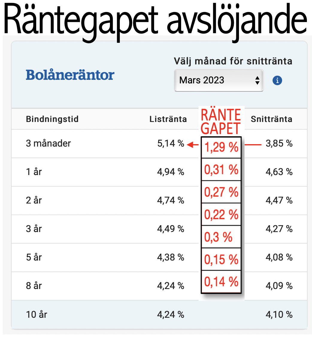 just den tanken har jag också grunnat på. Gapet kan vara en signal om att ”marknaden inte alls fungerar”. Men också att konsumenten uppenbarligen inte förstår vad hen köper. Särskilt som snitträntan och listpriset vara samma sak för 20 år sedan, men sedan glidit isär. Vart går smärtgränsen. Hur som helst ter sig listpriset vara ett låtsaspris. Ett som inte gäller. Inom fastighetsförsäljningar finns det regler för uppblåsta säljpriser. Inom bolånens listpriser får det fortgå. Än så länge.