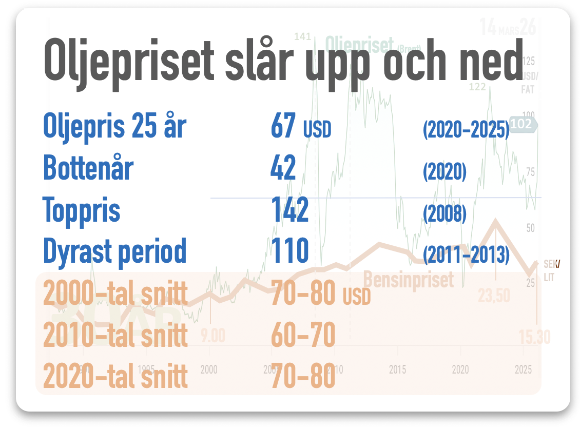 Priset på vår svenska bensin är upp från 9 till 15 kronor de senaste 25 åren. Oljepriset har samma tid varierat långt mer kraftigt och ökat fyrfaldigt.