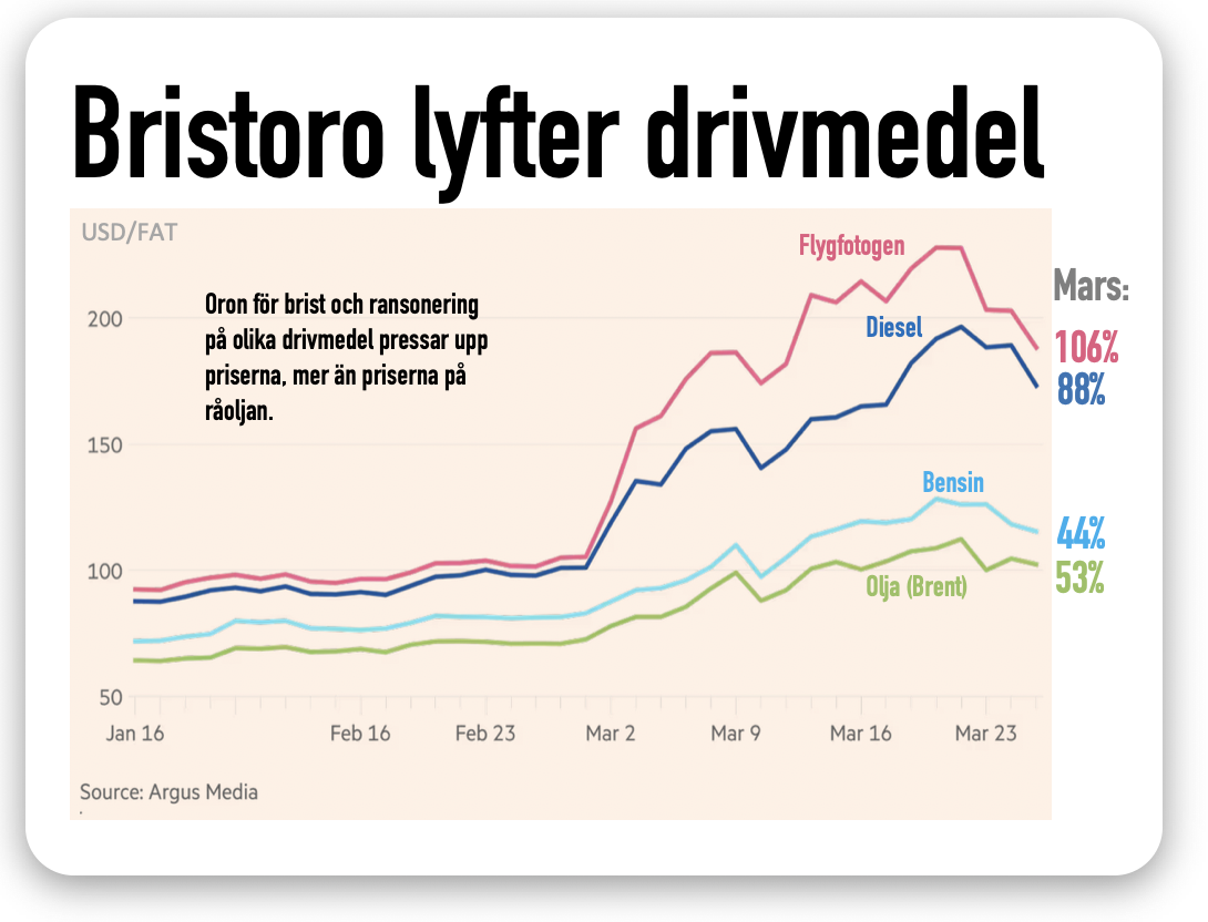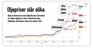 Störst kraft har den nya oljeinflationen i Asien. Där är oljepriset upp dubbelt så mycket som här i Europa. De hämtar mer olja via Hormuz än vad vi gör. De europeiska oljepriserna är betydligt lägre. Därmed får vi den närmaste tiden en dyrare import från Asien av varor som kläder, teknik, maskiner och material.