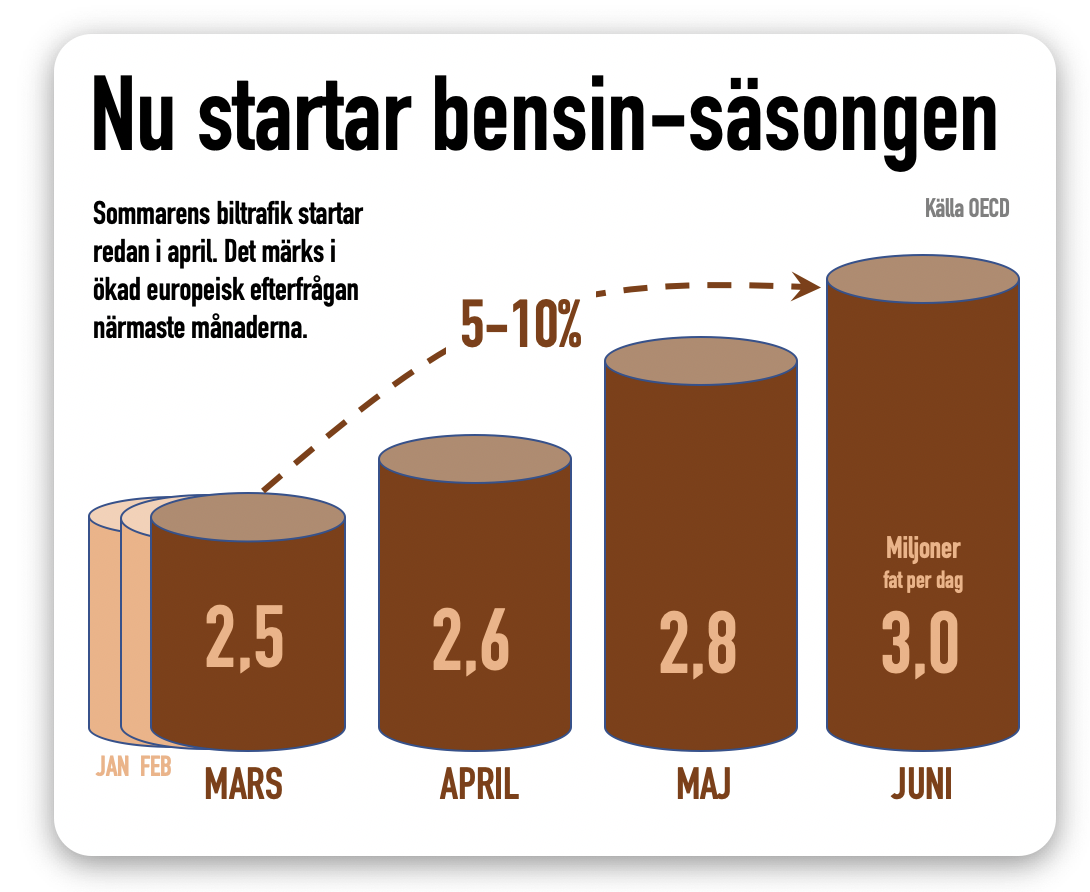 nu startar bensinsäsongenRedan i slutet av april brukar sommarvanorna märkas. Vi kör lite längre, gör fler helgutflykter och bensinkonsumtionen stiger 1–2 procent.