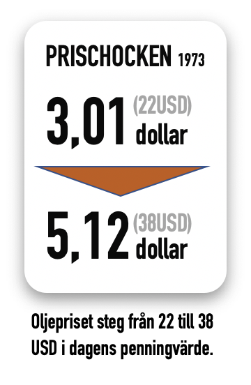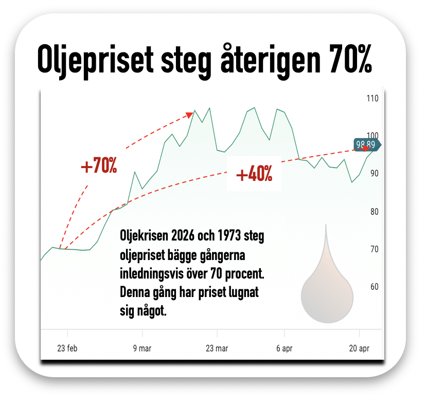 Även prisutvecklingen 1973 och 2026 påminner om varandra. Då steg oljepriset först med 70 procent, upp till 5 dollar – eller cirka 22 dollar i dagens penningvärde.