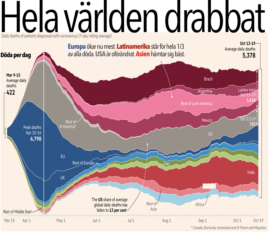 I Sverige märks hur fler blir sjuka, men färre dör. I USA och Europa är det mer ojämnt. Sedan får vi antagligen en tredje våg.