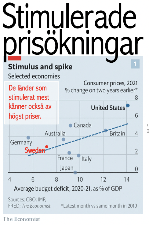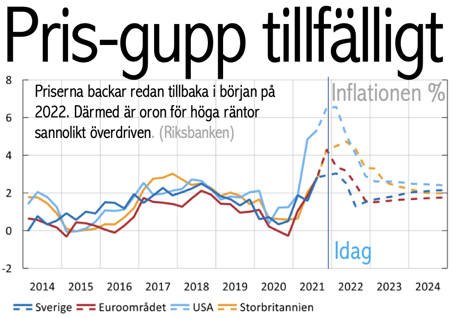 Redan är priserna istället på väg ned. Lika naturligt som stök skapar priseroro så ger lite lugn också mer sansade priser. Riksbanken väntar sig att priserna kulminerar just i denna stund. Därför höjer de inte räntan. Utan väntar nu på att pandemin ska ebba ut. Sedan får de se, säger de. Antagligen höjer de räntan först om 3 år. Och då till ynka 0,19%. Vilket skulle öka på svenskarnas snittränta från dagens 1,6% till 1,8. Inget att yvas över.