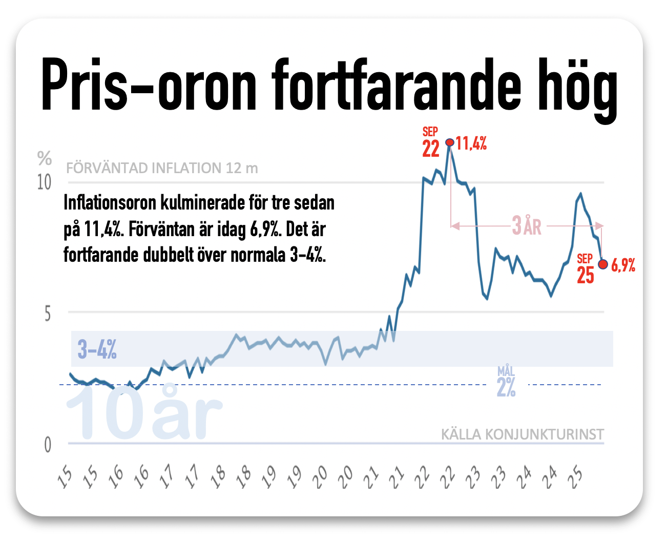 I dag förväntar sig svenskarna 6,9 % inflation. Det är dubbelt så hög inflation som var normalt under de lugnare åren av 2010-talet, då förväntan mest var 3-4 procent.