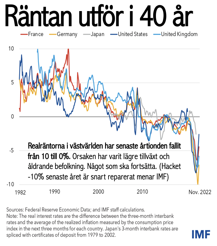 Därmed ser IMF senaste årets räntechock, som något tillfälligt. De riktigt långa förändringarna i samhället ger en bild av betydligt lägre räntor, världen över. Ja, det är inte tillfällig brist på halvledare eller olja som styr räntan i långa loppet. Utan hur ekonomierna mognar, växer och utvecklas.