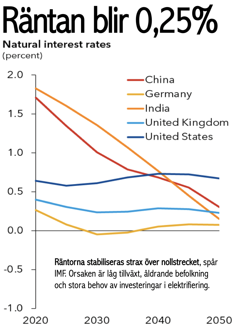 Hög räntor är bara en tillfällig överreaktion. Räntorna ska år 2030 ned till strax över nollstrecket spår IMF. Kina är där först år 2050. Orsaken är världens svaga tillväxt, åldrande befolkning och stort behov av investeringar i elektrifiering. Ja, IMF vill lugna oss och blicka framåt.