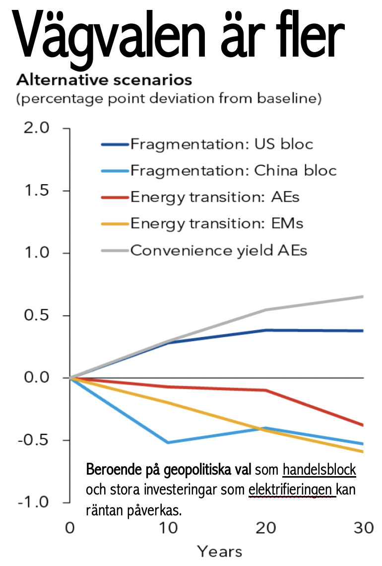 Samtidigt gör varje land sina vägval som kan påverka såväl tillväxt som räntan. Handelsblockaderna mellan USA och Kina väntas exempelvis får mycket olika roll. Där de kan skydda USAs tillväxt men sänka Kinas.