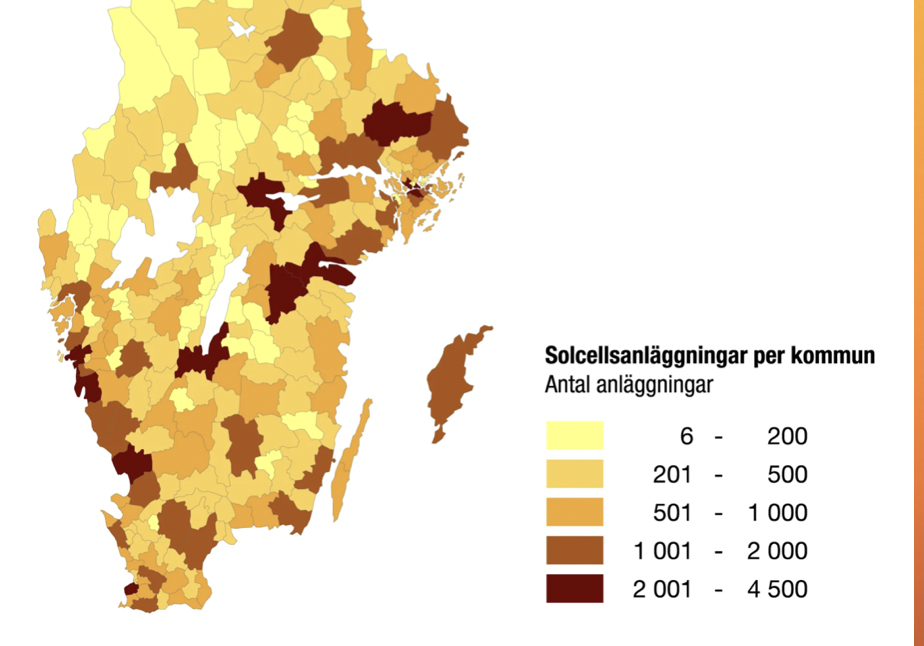 Och det finns mycket att göra. Bara jag tittar på spridningen av solpaneler över landet så är skillnaderna påtagliga. Det säger något om potentialen. Strax söder om Jönköping finns bara en tjugondel så många som i Jönköping.