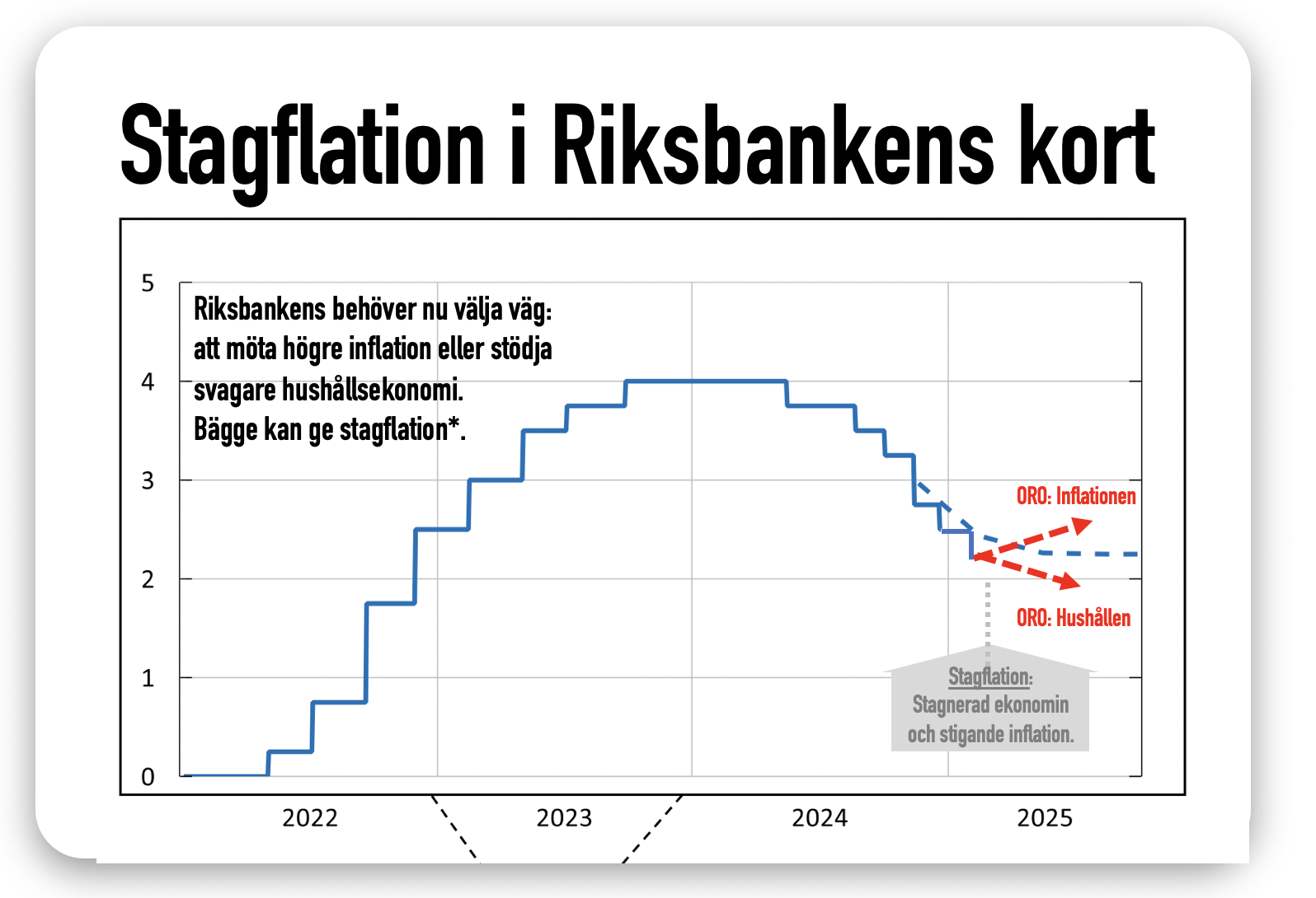 Stagflation i kortenRiksbanken behöver välja mellan att mota bort inflationen eller väcka hushållen. Bägge kan ge det obehagliga utfallet: stagflation.