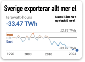 Nya nivån på exporten a 33 TWh sticker ut. Det är dubbelt mer export än snittet. Mellan 1980 och 2023 låg medel för årlig export kring 16 TWh.