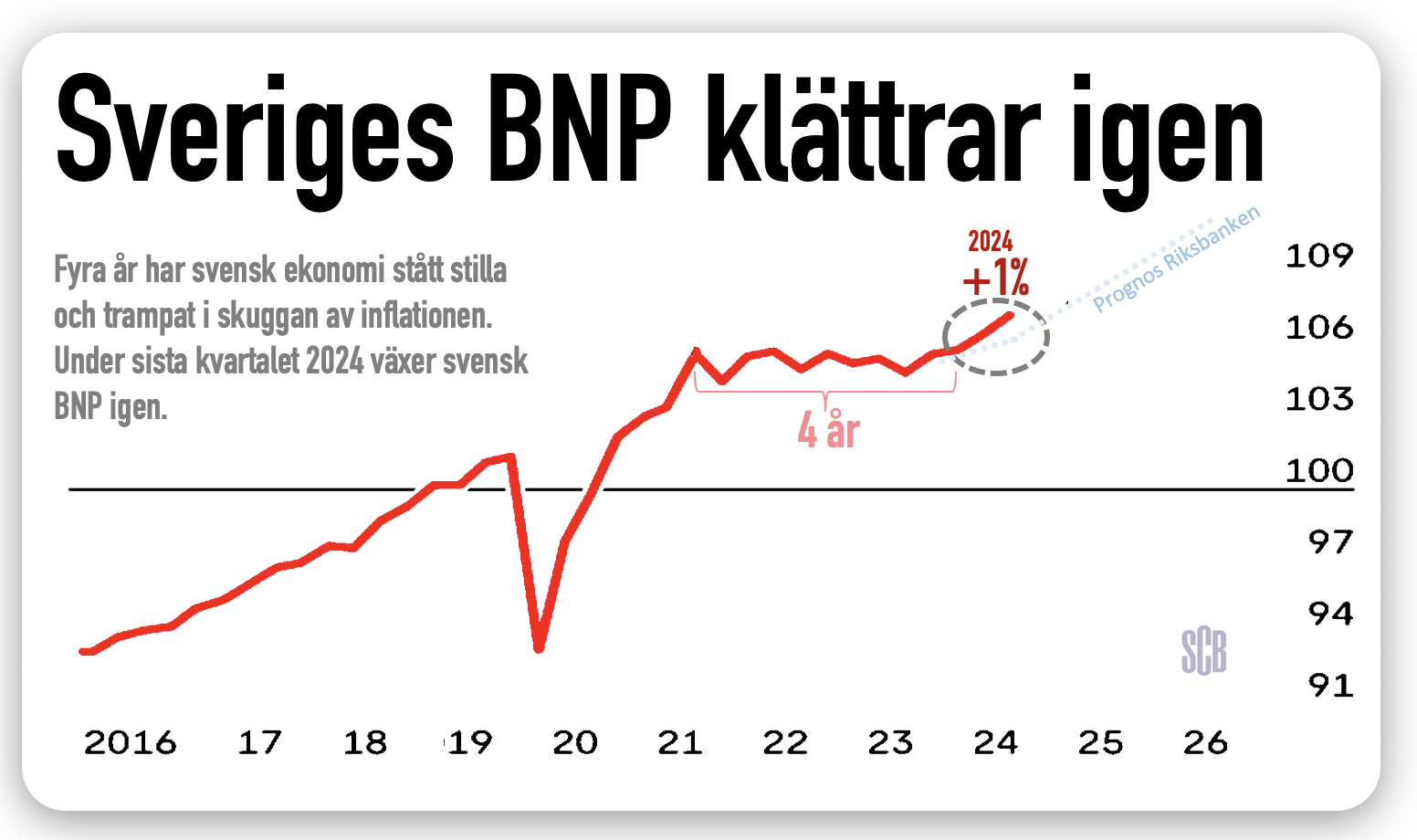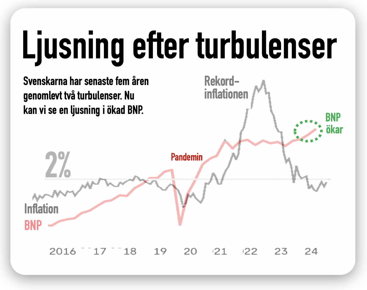 Fyra år av inflation har pressat svenskarna och Sverige. Vår ekonomi har stått stilla. Sista kvartalet 2024 kom plötsligt en ökning. Det kan båda ljusare tider.