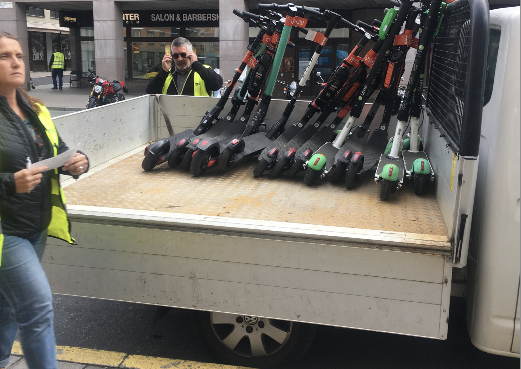 De nya cykelbolagen får nytt huvudbry… Första lasset med vårdlöst parkerade cyklar i huvudstaden, hämtades idag av kommunens gula västar. När jag möter dem 13.30 har första bilen efter bara hundra meter redan halva flaket fullt. ”Cykelbolagen får hämta ut sina cyklar för 500 kr stycket”, säger chefen för kommunens städpatrull. ///
