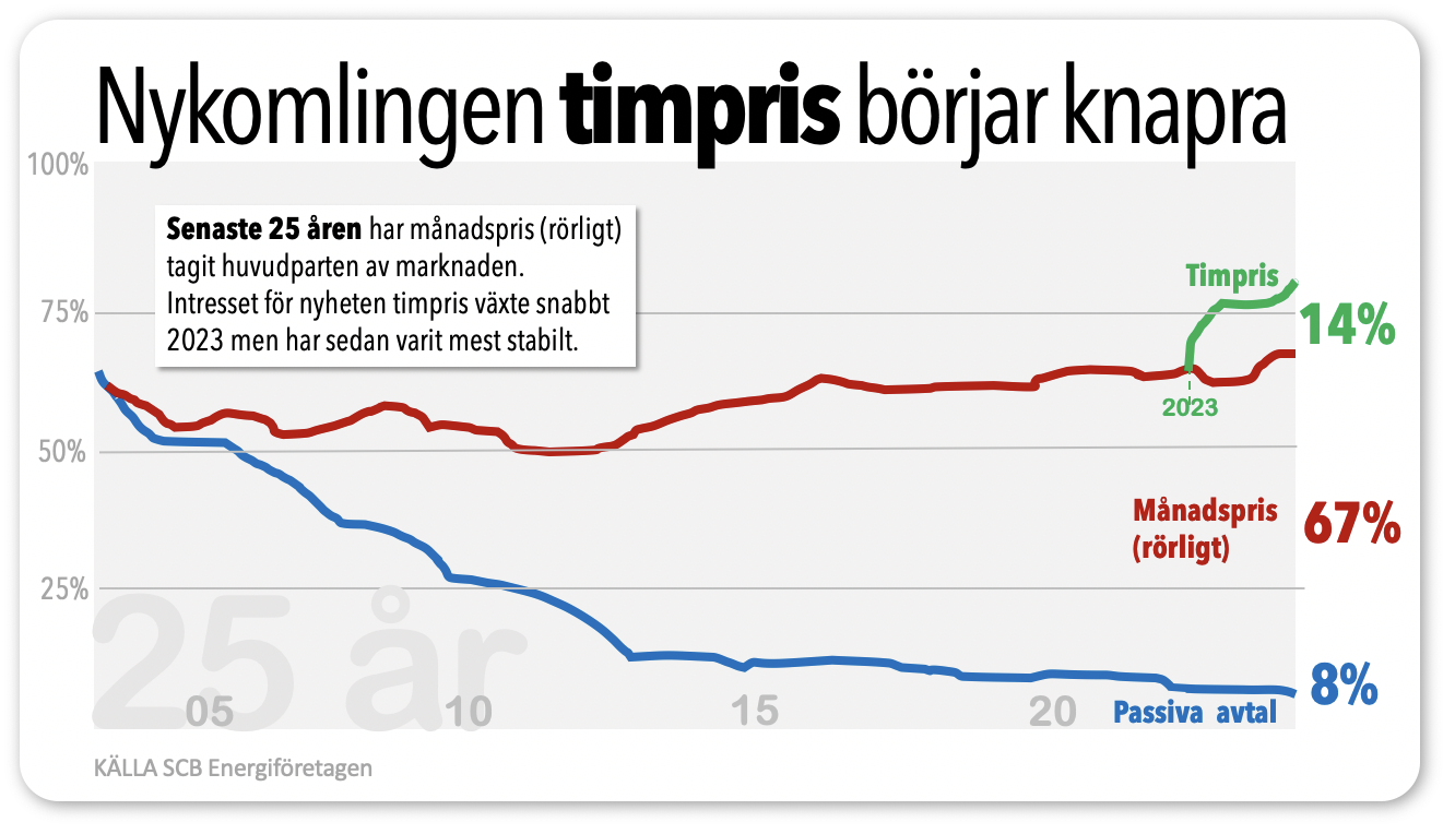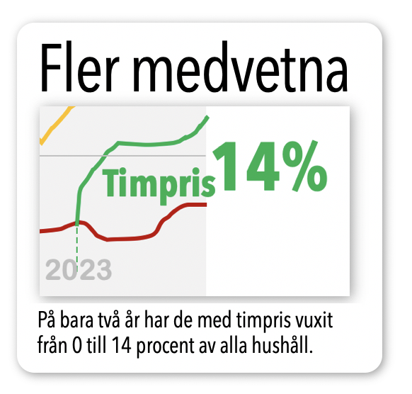 Vill vi kunna påverka valet av el efter prislapp så behöver vi välja timpris. Det är ganska nytt. Det har bara funnits några få år. Därför har många inte hittat dit än. Bara 1 av 7 svenskar har det.