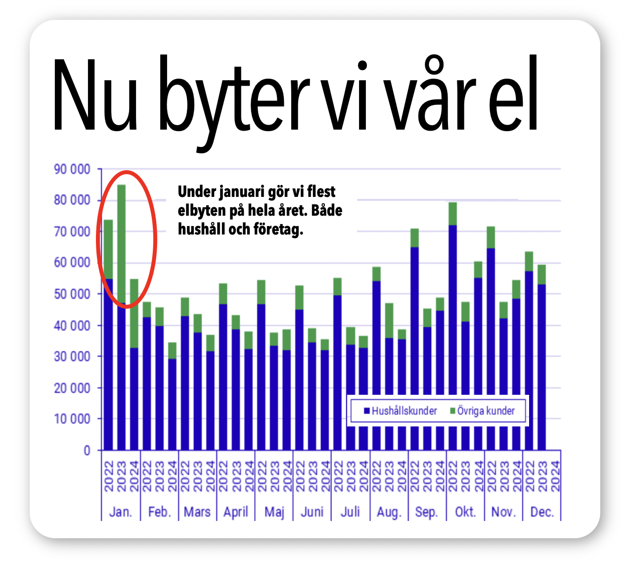 Kylan väcker svenskarnas intresse för elfrågor. Den starkaste reaktionen någonsin såg vi vid första prisuppgången 2022, visar statistik från SCB. Plötsligt i januari 2023 satt vi svenskt rekord. 85 000 svenskar byte elavtal under en enda månad. Även senast månaderna stiger intresset igen.