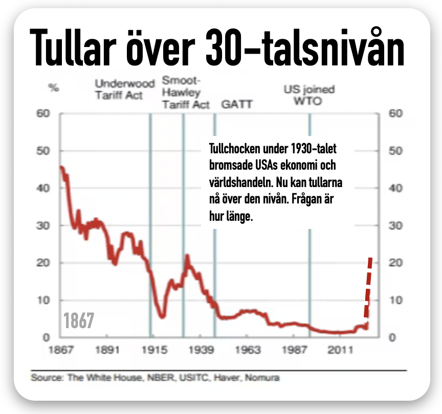 Trump nedkallar tullar över världen. Det låter nära nog bibliskt. Effekterna är däremot osäkra. Titta bara på 30-talets tullar. Det gör att politiken och utfallet skapar mest osäkerhet. 10–20 procents tullar är en prognos. Men en viktigare fråga är hur länge de håller i sig.