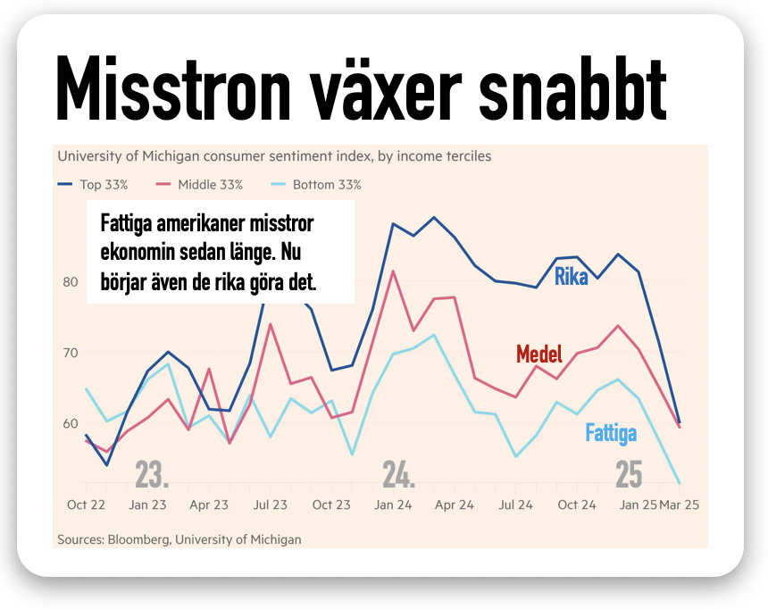 Men när den vanlige amerikanen upplever sig fattig de närmaste månaderna, på grund av tullar och lågkonjunktur i USA, lär Trump behöva backa ur tull-eländet med någon simpel ursäkt.