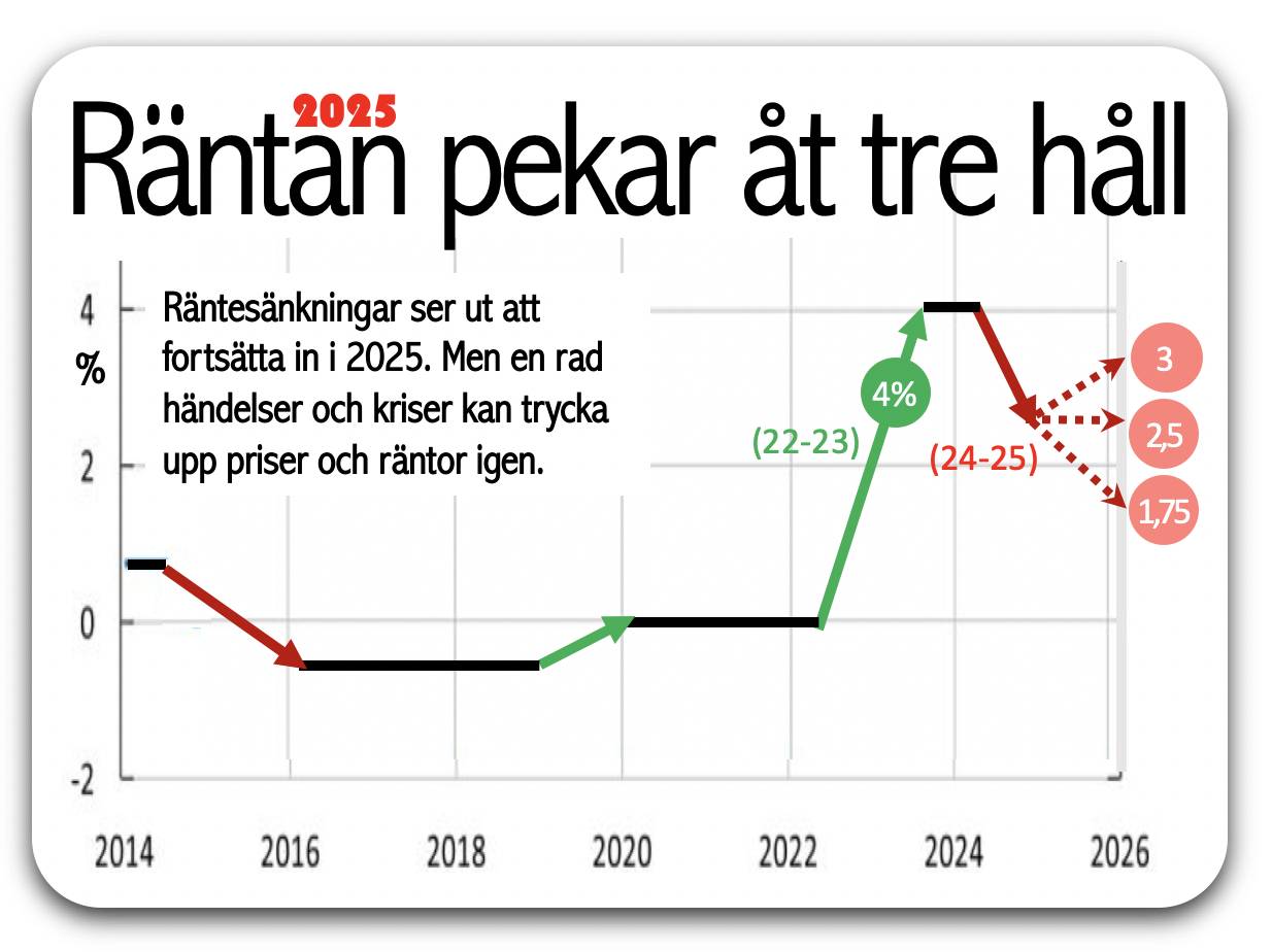 Fallet i räntor väntas fortsätta. En rad rapporter pekar på att vi har en styrränta kring 1,5 procent redan till sommaren. Det ger en boränta på 3 procent. Det skänker snitthushållet två månadslöner tillbaka jämfört med räntetoppen.