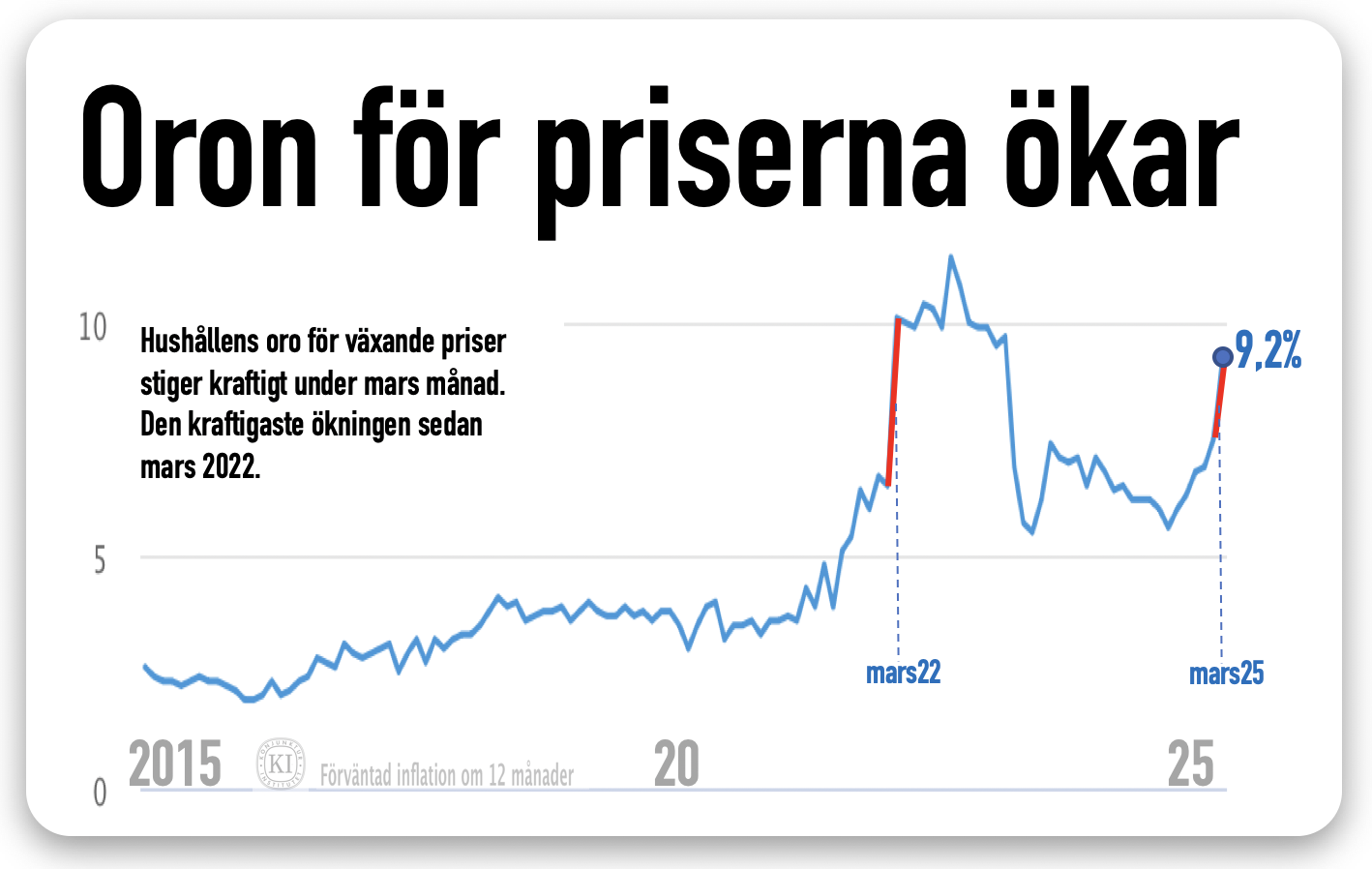 Tullarna har redan börjat märkas hos hushållen. Oron för prisökningarna framåt (12 månader) är idag betydligt större än för bara några månader sedan.