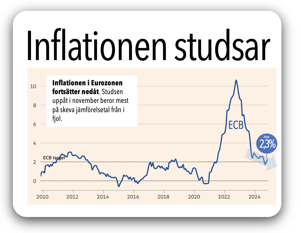 Vädret överraskar inflationen så här års. Mellanmånaden november kan stå och väga. Ovanligt mild höst och nivån på energilager gör att priser kan studsa till. Det syns tydligt i ECBs statistiken. Energipriserna föll fjol vilket gör att årets inflation ter sig ovanligt hög. Men trenden är tydligt nedåt. Mer inflation.